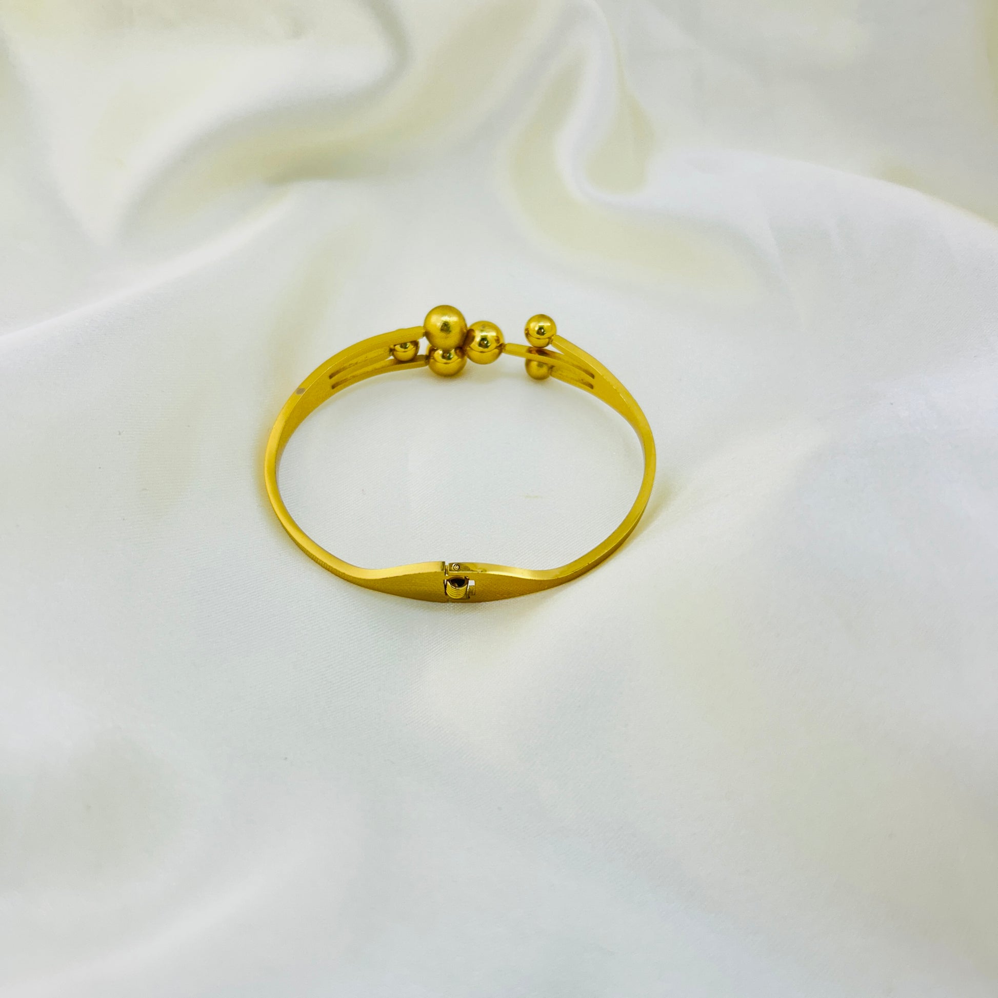 This demi-fine open cuff bracelet redefines minimal style with its sleek silhouette and sculptural detail. Each end features a cluster of three polished gold spheres, creating a balanced and timeless design that pairs seamlessly with any outfit.