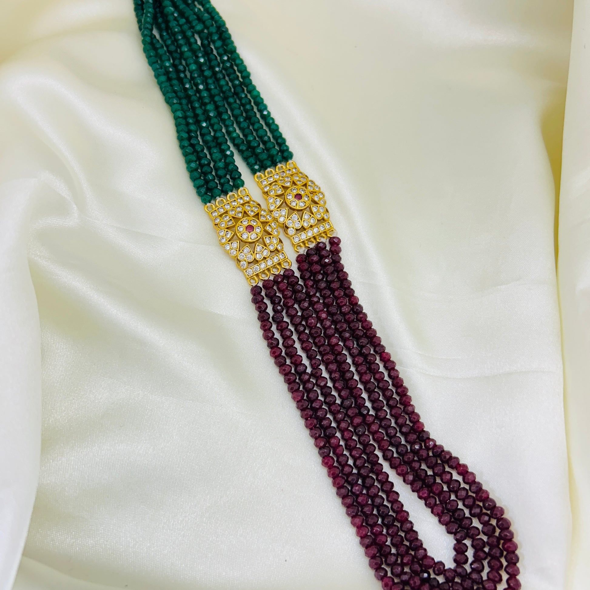 Elegant, traditional, and beautifully balanced — this Dual Tone Onyx Four-Layer Long Haara is designed to make a subtle yet striking statement. The haara features a refined combination of dark green onyx beads above the side pendants and deep maroon onyx beads below, creating a rich two-colour contrast.