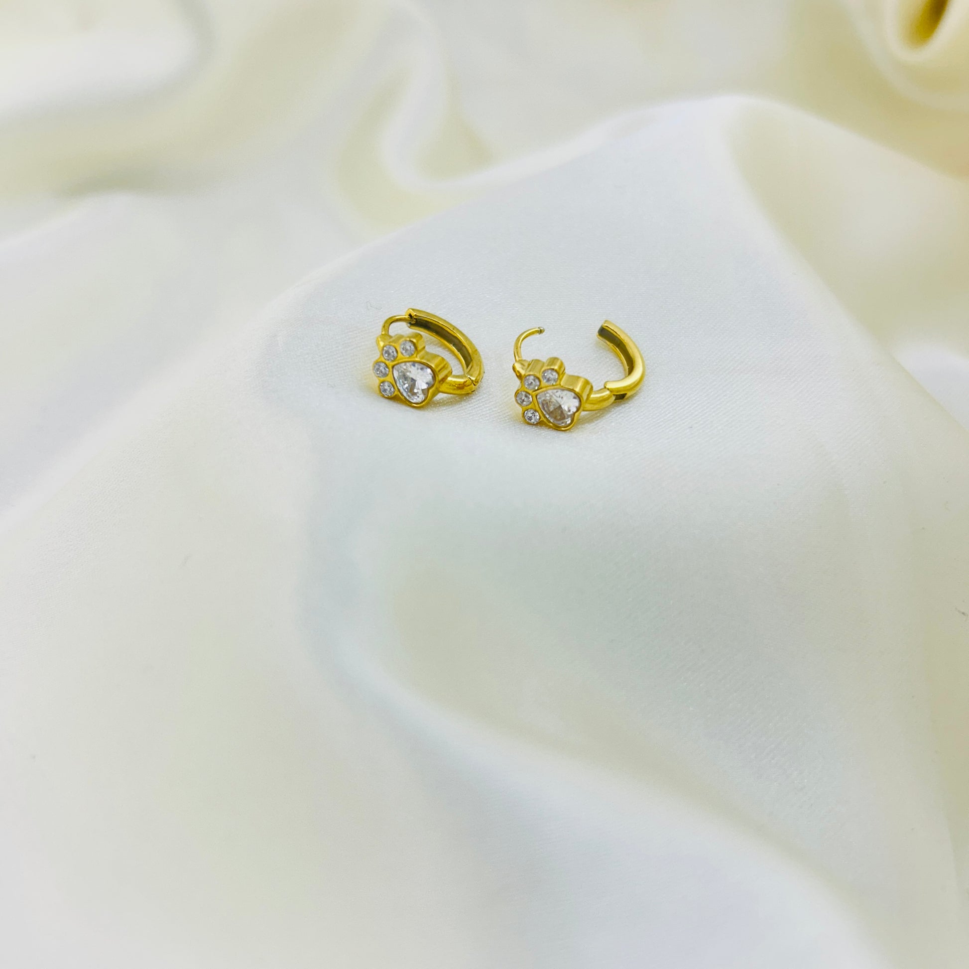 Paw Hoop Earrings – Elegant 18K gold plated hoops adorned with white stone paw charms, symbolizing loyalty and unconditional love.